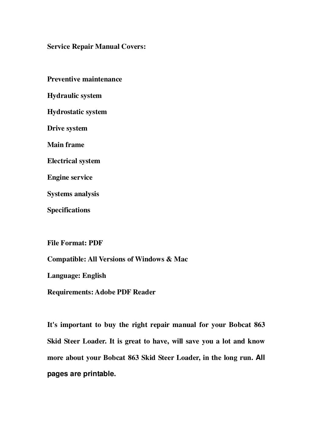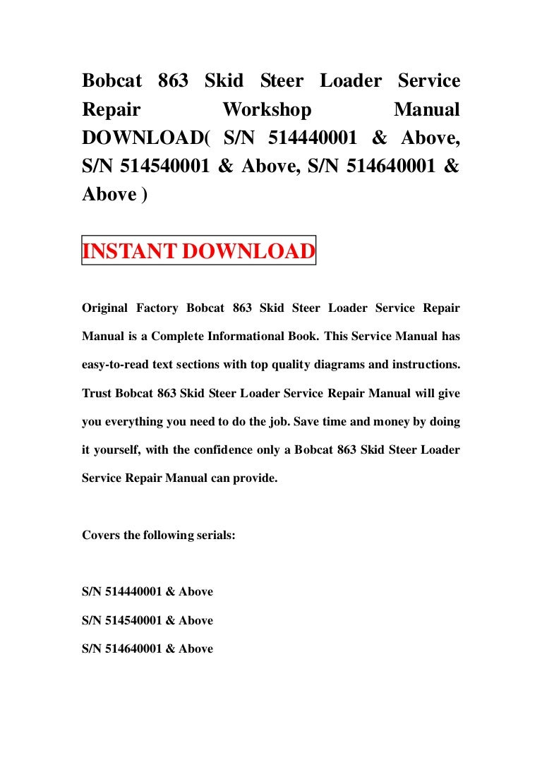 Bobcat 863 and 863H Skid-Steer Loader Service Manual | Bobcat, Repair